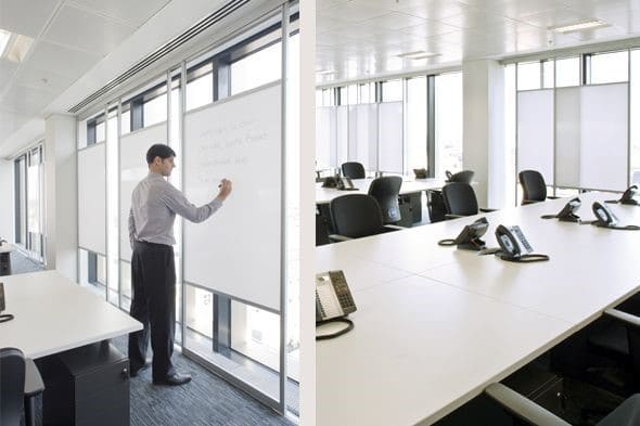تخته وایت برد یکی از اقلامی است که به طور معمول در دفاتر کاری استفاده می شود. برای استفاده کاربردی از از تخته وایت برد می توانید از تخته های بزرگ در بین فضاهایی که قصد جدا کردن آن ها را دارید استفاده نمایید. بدین صورت تخته را تبدیل به یک پارتیشن اداری مدرن نموده اید. تخته وایت برد را به صورت ریلی به کار ببرید تا در صورت لزوم آن را جا به جا نمایید.