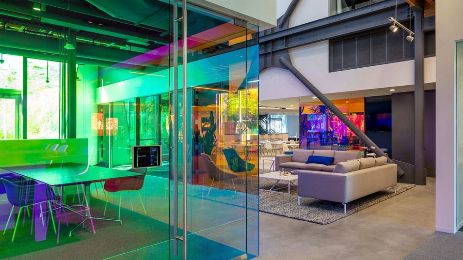 شیشه های رنگارنگ برای نشان دادن فضاهای جمعی - اتاق های هیئت مدیره، اتاق های جلسات و مکان های تجمع غیررسمی تر استفاده می شود. در همین حال، ایستگاه های کاری کارکنان در گوشه های ساختمان قرار داده شده است تا کارکنان به خوبی نور طبیعی که از شیشه های رنگی عبور می کند دریافت کنند