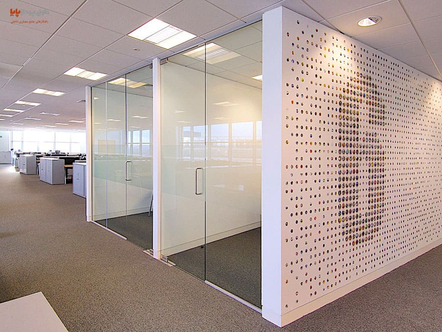 پارتیشن های شیشه ای میتوانند در دو نوع ثابت یا متحرک به دفتر کار اضافه شوند که نوع ثابت با حفظ ارتباط بصری ، فضا را به طور کامل به دو بخش مجزا تقسیم میکند و ظاهری مدرن به محیط می بخشد اما نوع متحرک با جابه جا شدن در محور کفی و سقفی ریل های خود در صورت نیاز میتواند فضا را ببندد یا باز کند اگر در ساخت پارتیشن شیشه ای از انواع شیشه آکوستیک استفاده شود از عایق صدا نیز برخوردار خواهید شد اما اگر به حریم خصوصی بیشتری نیاز دارید میتوانید از انواع شیشه سندبلاست شده به جای شیشه شفاف استفاده نمایید شیشه های آکوستیک برای برگزاری جلسات داخلی و گفت و گو با مشتریان بسیار مناسب هستند