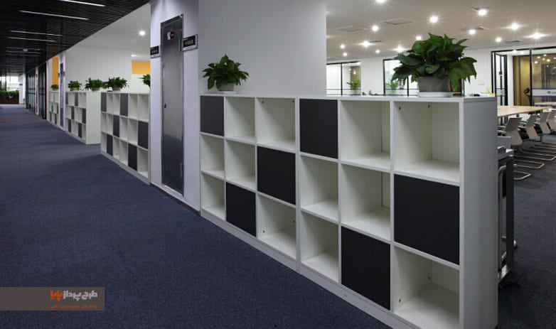 پارتیشن های قفسه ای : پارتیشن های قفسه ای راه بسیار خوبی برای جداسازی یک فضا و در عین حال افزودن فضای ذخیره سازی هستند. پارتیشن های قفسه ای را می توان از چوب، فلز یا مواد دیگر ساخت و می توان آنها را در رنگ های متنوعی برای مطابقت با دکوراسیون اتاق تکمیل کرد. این سبک پارتیشن اداری مدرن یک گزینه عالی برای کسانی است که می خواهند فضایی خصوصی در یک اتاق ایجاد کنند و در عین حال می توانند کتاب ها یا موارد دیگر را به نمایش بگذارند.