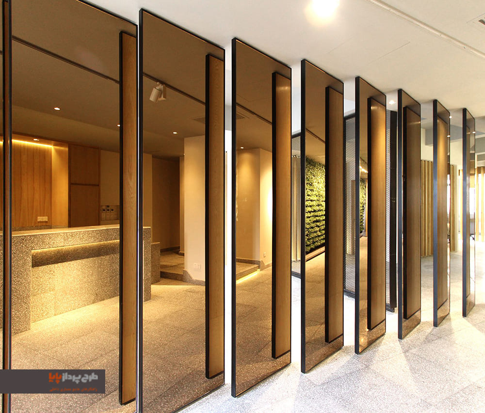 پارتیشن های آینه ای: پارتیشن های آینه ای راه بسیار خوبی برای ایجاد خطای دید در اتاق هستند. آنها نور را منعکس می کنند و باعث می شوند فضا بزرگتر به نظر برسد و می توان از آنها برای جدا کردن یک فضا استفاده کرد. پارتیشن آینهای را میتوان از شیشه ساخت و میتوان آن را در قابهای مختلفی برای مطابقت با دکوراسیون اتاق تکمیل کرد.