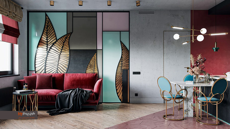 پالت های رنگی آرت دکو معمولاً دارای تضادهای برجسته هستند. ترکیبهای سیاه و سفید محبوب اند و اغلب با رنگهای برجسته مانند قرمز، آبی سلطنتی یا سبز زمردی همراه میشوند. این رنگ های پر جنب و جوش، انرژی و تاثیر بصری به فضا می آورند.