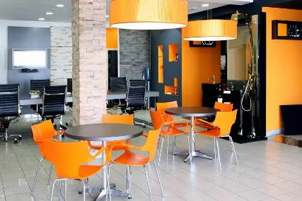 رنگ نارنجی به شکل معمول بیشتر در طراحی داخلی رستوران ها و فست فودها به کار می رود. برای استفاده از این رنگ در فضای کاری می توان یکی از بخش های سازمان را که کمی غیر رسمی تر است برای این رنگ در نظر گرفت. برای مثال اگر کافه یا غذاخوری در محل کار خود دارید می توانید از رنگ نارنجی استفاده کنید. البته در دیگر فضاهای محیط کار نیز میتوان این رنگ را به کار برد، به شرطی که بتوان انرژی و گرمای آن را تعدیل کرد و برای این کار می توانید از رنگ طوسی استفاده کنید.