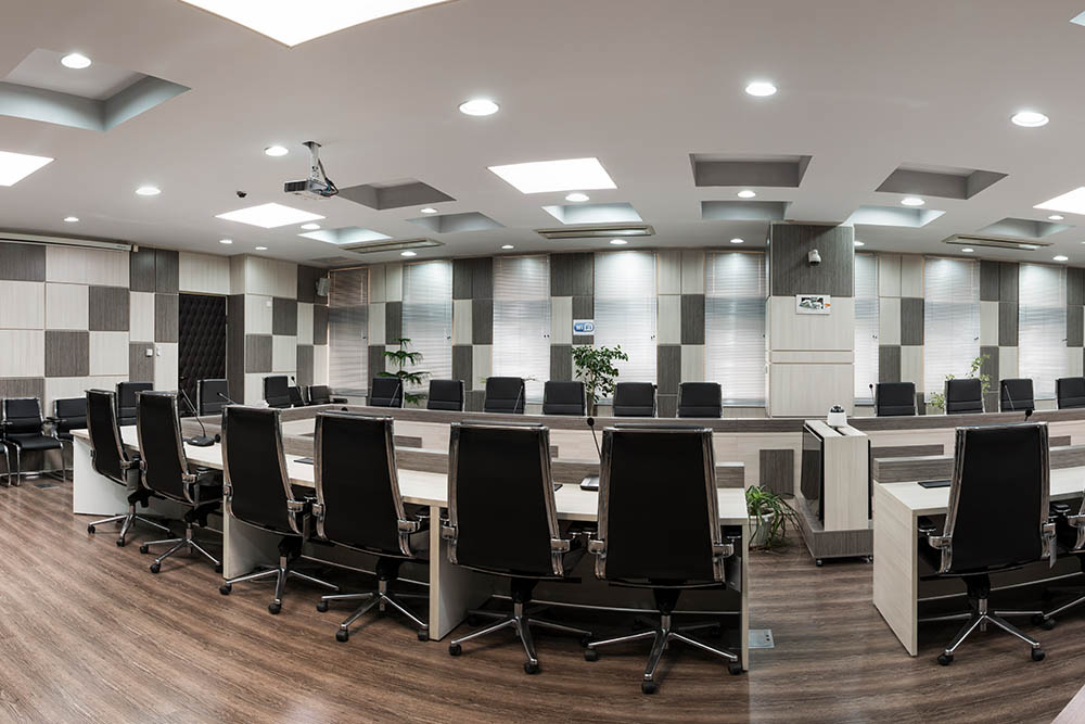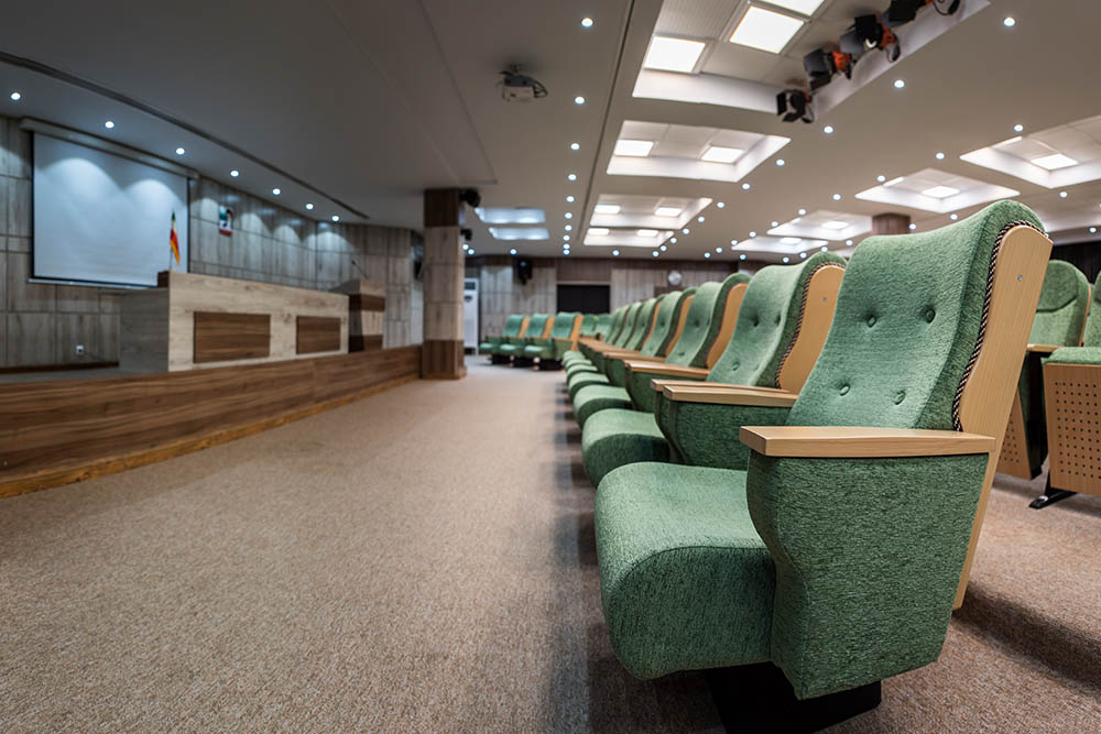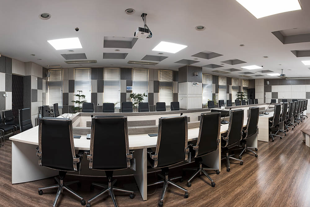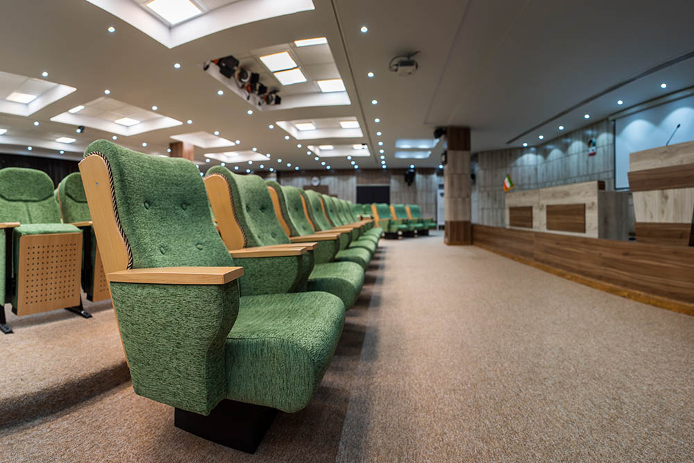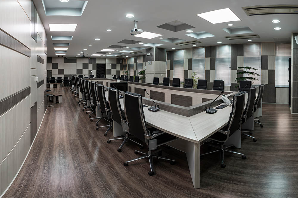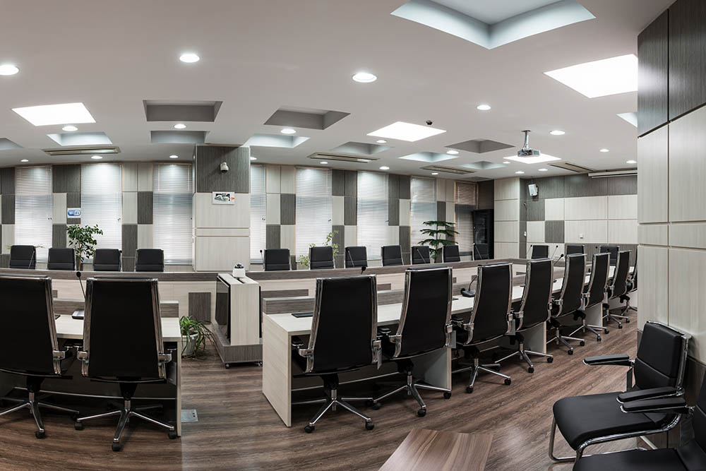 استفاده از پارتیشن بندی و سازه های ام دی اف و قالب فلزی برای استحکام بیشتر، از مشخصات بارز این طراحی است. رنگ قالب سالن کنفرانس از طیف رنگی قهوه ای سیـر و روشن انتخـاب شده که در ترکیب با رنگ های خنـثی ( خاکستری و خـاکی ) جـلوه بصری خیره کننده ای ایجاد کرده است. در مـیز بزرگ سالن کنفرانس به همراه صنـدلیها همگی از همین طیـف رنگی اصلی کمک گرفته شده است.جهت جایگذاری سیستم های صوتی و عبور سیم برق در پارتیشن، تمهیدات لازم انجام شده و فضـای مناسب پیش بینی و ایجاد شده است.