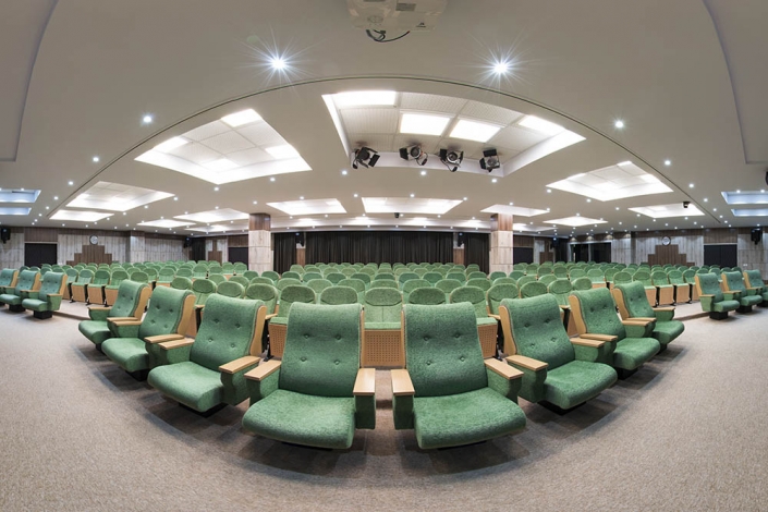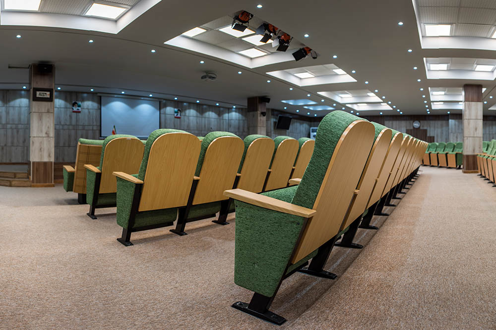 سالن آمفی تئاتر نیز از تناژ رنگی قهوه ای کار شده که شامل پارتیشن جایـگاه و سن نیز می شود.طراحی پژوهشکده امام خمینی به عنوان یک مکان علمی و دانشگاهی با ویژگی های اختصاصی همراه بوده و استفاده هوشمندانه از رنگ سبز در صـندلیها تضاد خوبی با رنگ قهوه ای روشن و رنگ کرم بخش چوبی ایجاد کرده است.شرکت “پایا”طراح و مجری دکوراسیون داخلی، از تکنیک های طراحی و تجـهیزات روز دنـیا برای طراحی، اجرا و بهره برداری از این پروژه بهره گرفته است.
