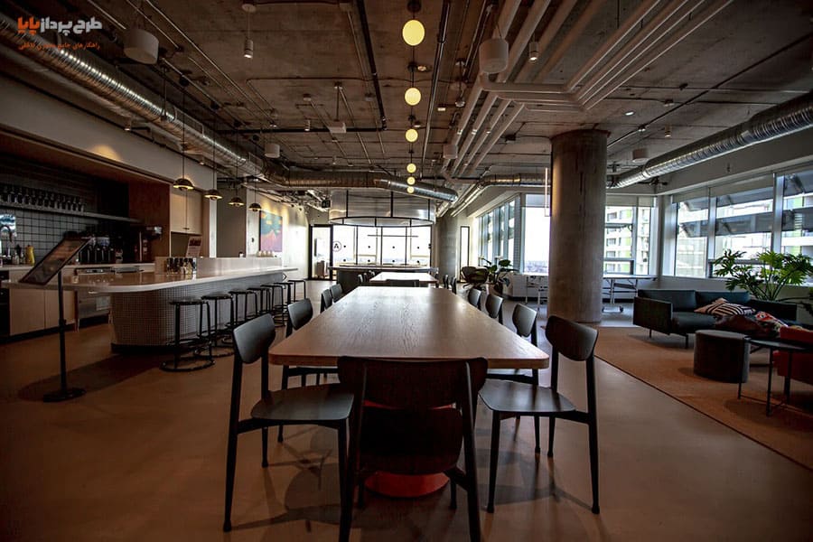 در این سبک طراحی فضای کار مشترک رنگهای تیره تر مورد استفاده قرار میگیرند، این طراحی تفکر متفکرانه و جدیت را القا میکند. لولهها و کانالهای اکسپوز در سقف به همراه پنجرههایی که کل منطقه را احاطه کردهاند، به طراحی فضای مشترک احساس باز بودن میدهد و همکاری و تبادل آزاد ایدهها را تقویت میکند